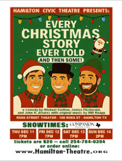 With a modest beginning in 1984, where children played all the roles of Shakespeare’s “Midsummer Night’s Dream” on the Courthouse lawn, Hamilton Civic Theatre has involved the community in a love of words, acting, and stagecraft. From 1984 through 1991, HCT produced plays in the Woman’s Council building located at 110 West Main. From 1992 until 2001, the theater group used the facilities of the old Texan Theater at 104 S. Bell. In 2004, Hamilton Civic Theater incorporated, obtained non-profit status, and purchased the building at 108 Ross Street in Hamilton, its permanent home.