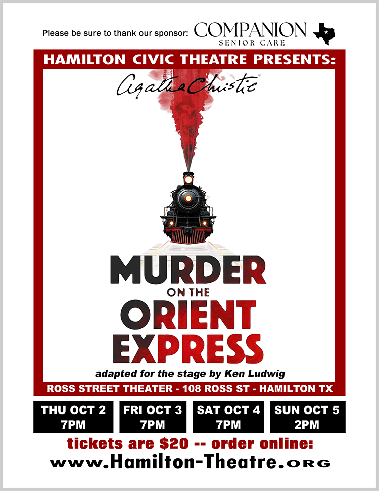 WELCOME: The Hamilton Civic Theatre invites you to its upcoming show, Murder on the Orient Express, to be held at the Ross Street Theater, 108 Ross Street, Hamilton Texas 76531.